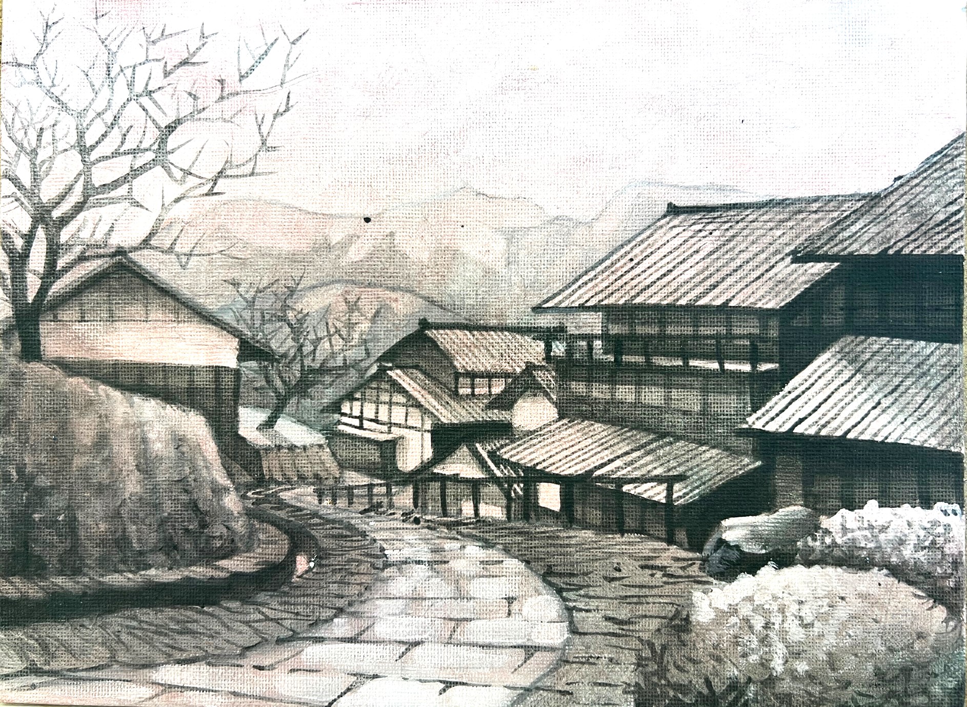 Vaša maľba s mestským motívom v monochromatickom prevedení.
